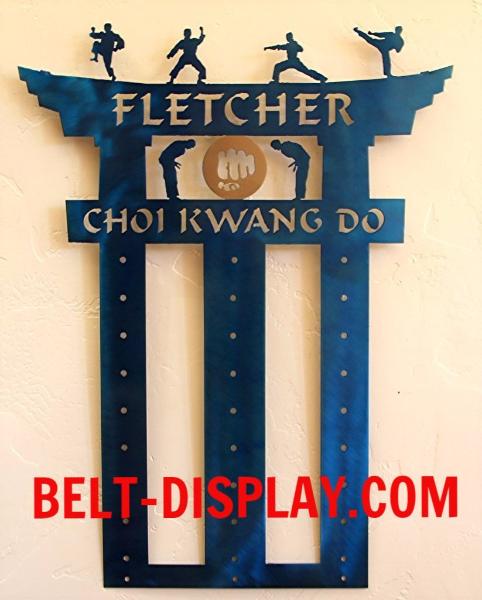 This display comes with the Red and Blue Korean flag ying yang that can be ordered in all our colors. You can add your choice of Martial Arts Symbols beneath the name for Karate, Jujitsu, Taekwondo, Tang Soo Do, etc. This unique rack is designed to display from 6 to 17 ranking belts, and can be personalized with name. All of our Martial Arts Belt Displays come with 1'' from wall stand off concealed mounting. Above Pictured Karate Belt Display Rack is shown in a satin black finish and precision cut from High Quality Steel. All our products are computer designed. All our designs are available in various colors and sizes. This belt display can be ordered with male or female images.